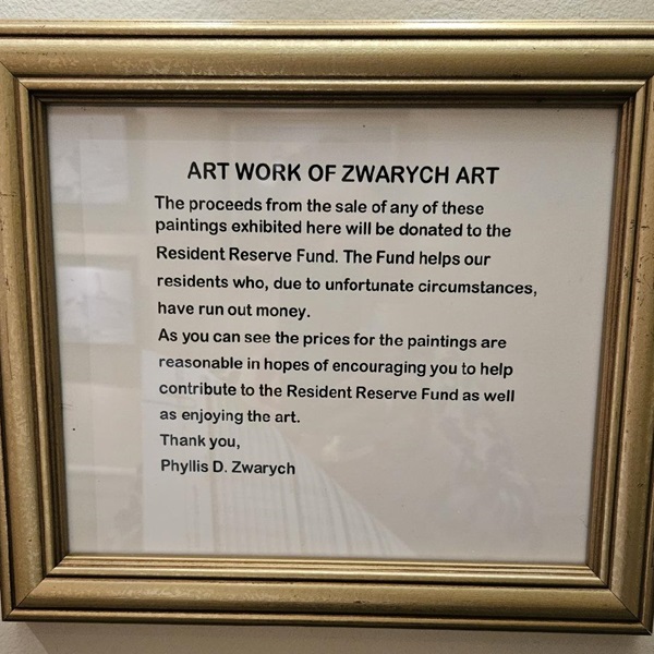 This exhibit is open to the public and offers an opportunity for both residents and guests to view and purchase Phyllis’ artwork. Visitors are welcome to stroll the gallery hall Monday through Friday from 9:00am-4:30pm (no appointment required) until January 31. Purchases can be made by cash or check (written out to The Springpoint Foundation).
